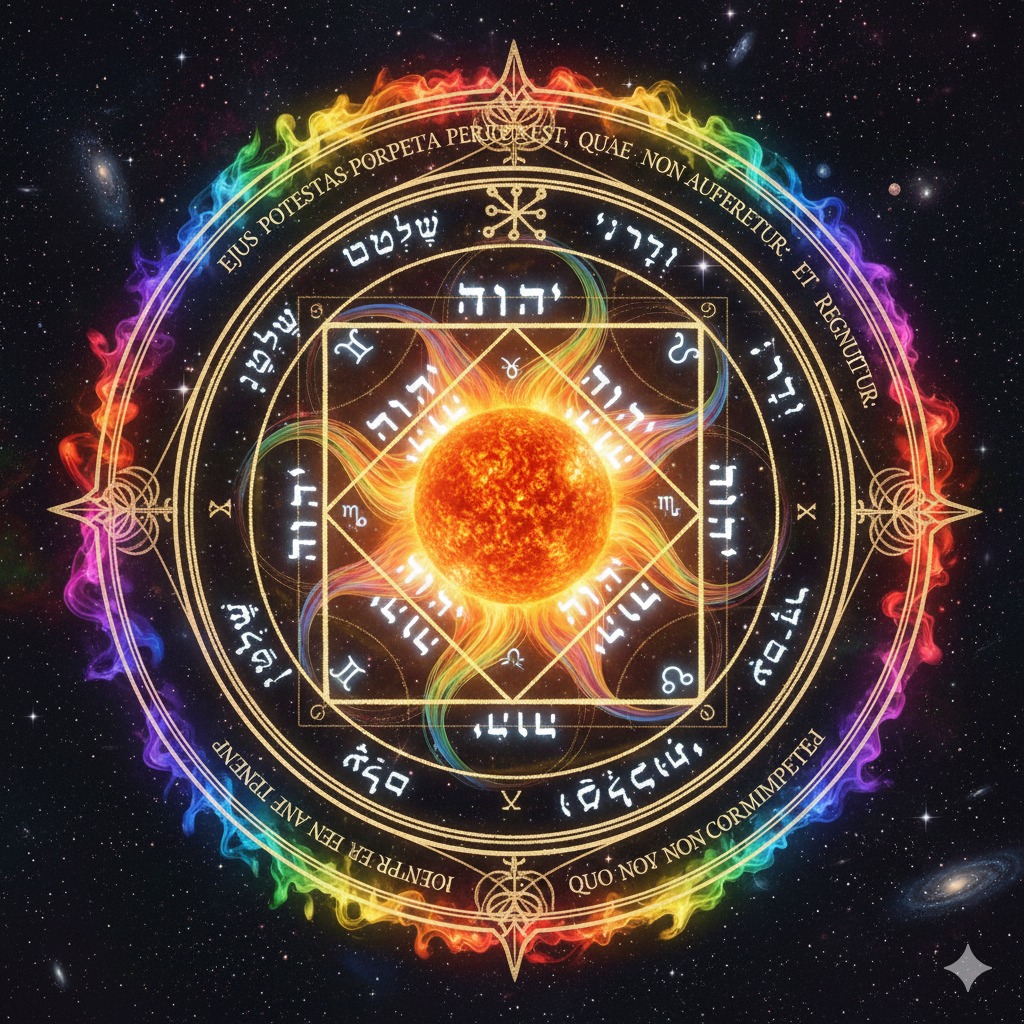 Auringon Dynaamisuutta: YHVH, Jumalan muuttuva nimi (neljä kirjainta viittaavat menneeseen, nykyiseen ja tulevaan), heijastaa Auringon jatkuvaa muutosta ja syklejä (esim. magneettikentän polariteetin vaihto). Aurinko on jatkuvasti uusi, mutta sen olemus pysyy.