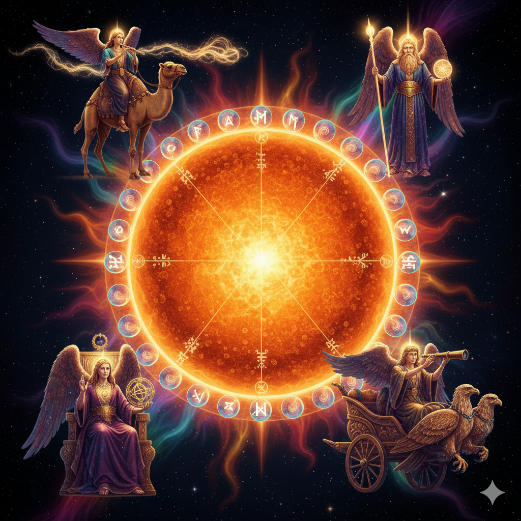 IAN: Piirrä kuva jossa nämä symbolit yhdistyvät seuraavasti: Kuvan keskellä on kirkkaasti loimuava ylevän näköinen auringonkiekko jonka reunoilla on kompassiin liittyviä merkintöjä. Kuvan oikealla yläkulmassa on säteilevä partainen enkeli jolla kädessään on sauva ja kiekko. Vasemassa yläkulmassa on taas kamelin selässä istuva kaunis miespuolinen enkeli joka soittaa huilua. Oikeassa alakulmassa on puolestaan haukan vetämässä vaunussa kulkeva enkeli joka katsoo kaukoputkella ja vasemmassa alakulmassa on valtaistuimella istuva enkeli joka toisella kädellä siunaa ja toisella kädellään pitelee astrolabia.
