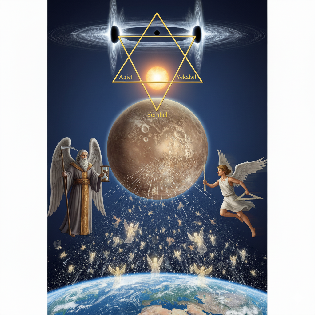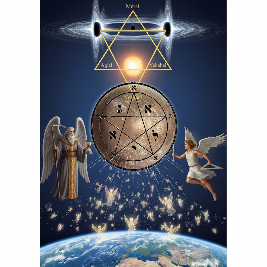 IAN: Tee kuva jossa nämä symboliikat ilmentyvät. Kuvan keskellä on Merkurius planeetta suurena. Merkuriuksen yllä on sakara ylöspäin oleva kultainen pentagrammi. Sen kulkimissa lukee nimet Agiel ja Yekahel. Merkuriuksen yläpuolella on pieni aurinko jonka yllä on kuvattuna kahden mustan aukon törmääminen ja gravitaatioaaltoja. Kuvan alalaidassa merkuriuksen alapuoella näkyy maan pintaa ja ilmakehää joka näyttää samanaikasesti hiukkaskiihdyttimen sumukammiossa olevista törmäyksistä ja niistä syntyvää hajontaa, kosmisten säteiden osuessa ilmakehään. Näistä törmäyksistä näyttää syntyvän lukemattomia henkisiä olentoja, henkiä, enkeleitä ja kummituksia. Kuvan vasemmalla laidalla seisoon kaapuun pukeutunut vanhan näköinen enkeli jolla käsissään viikate ja tiimalasi. Kuvan oikealla laidalla puolestaan on nuori nopeassa pyörteessä ja vauhdissa liikkuva siipijalkainen enkeli jolla käsissään mittatikku ja suorakulma.